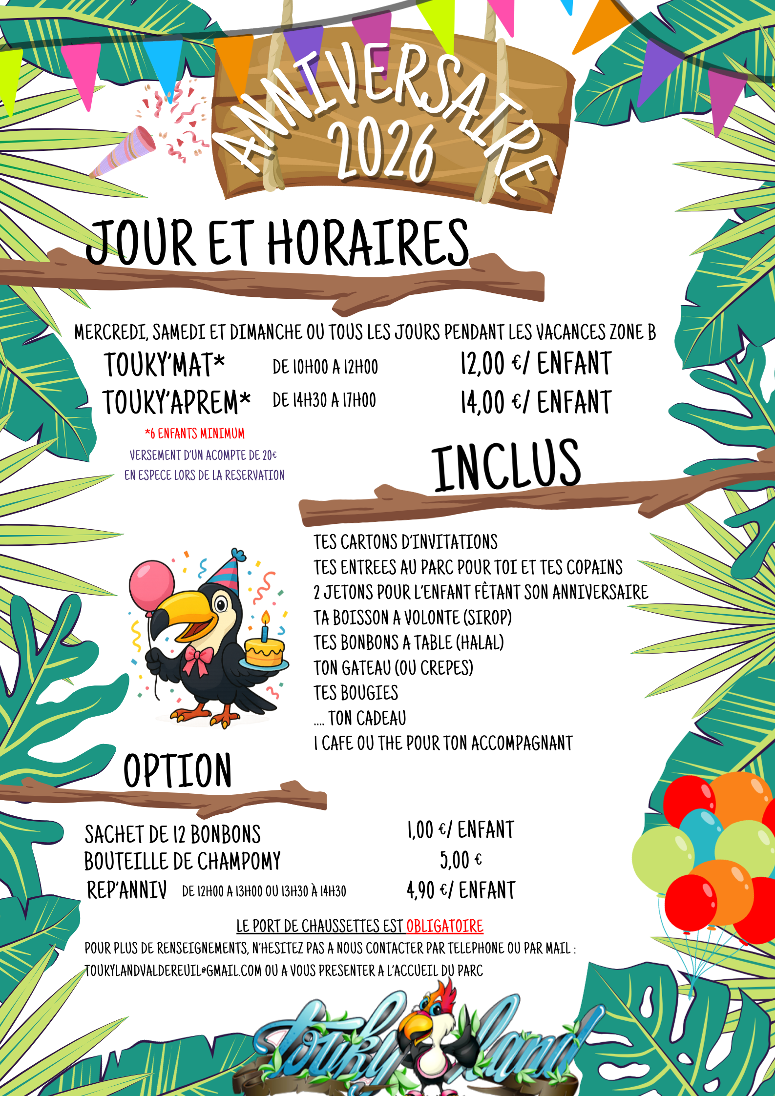 Vous souhaitez réserver pour un anniversaire ? N'hésitez pas à venir nous rencontrer directement à l'accueil du parc. Vous pouvez aussi nous contacter par mail : toukylandvaldereuil@gmail.com ou par téléphone au : 02.32.59.47.75